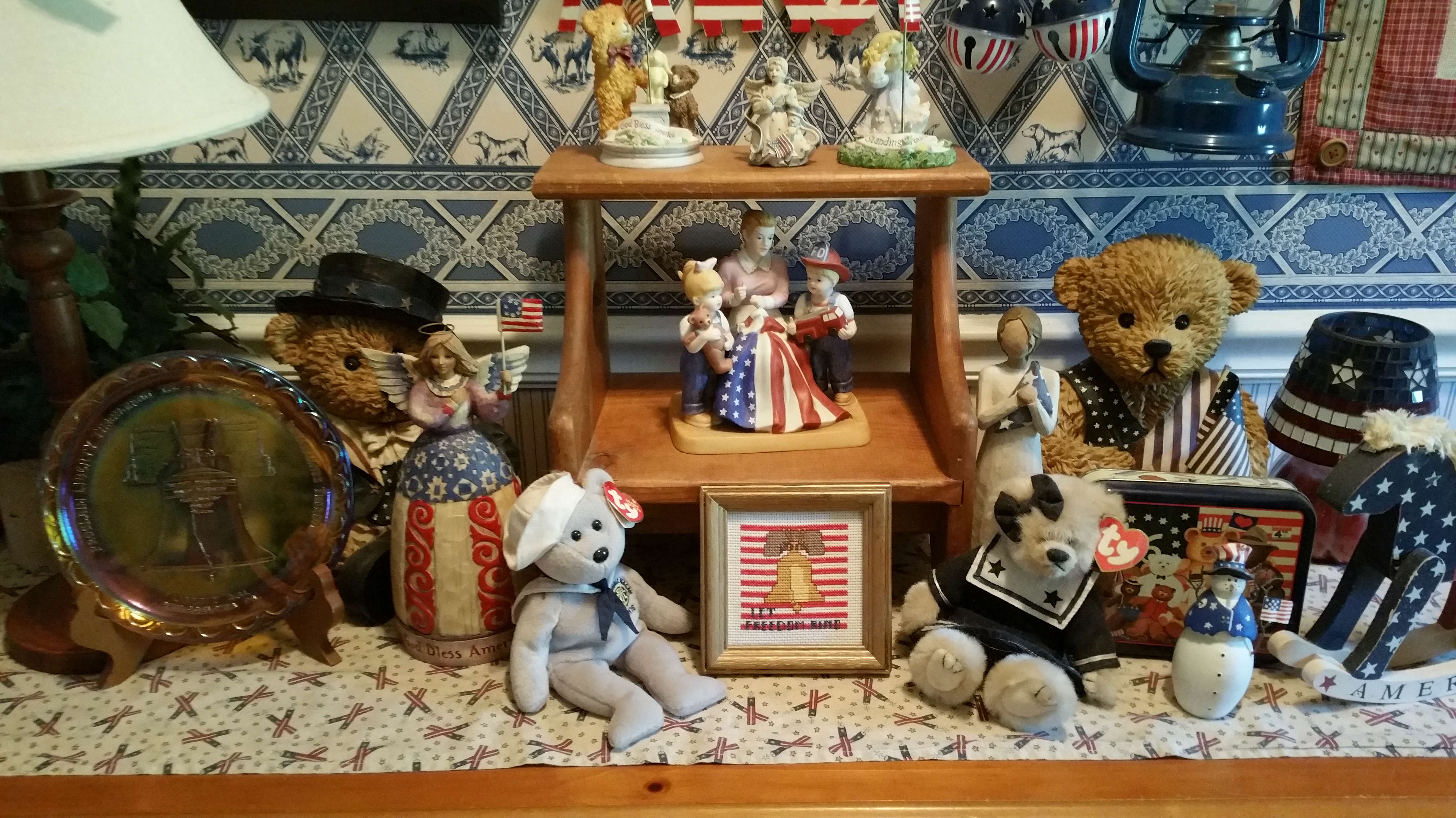 Along  one wall in my foyer, I have a narrow table filled with American-themed stuff.  On the left is a carnival glass, bicentennial Liberty Bell plate, which I really love.  In the center, I took an old child’s stool (yard sale find) and used it as a display stand for some of my flag-themed figurines.  At the bottom-center is a small counted cross-stitch piece I did last year.  That gold frame was one of my typical repurposed projects.