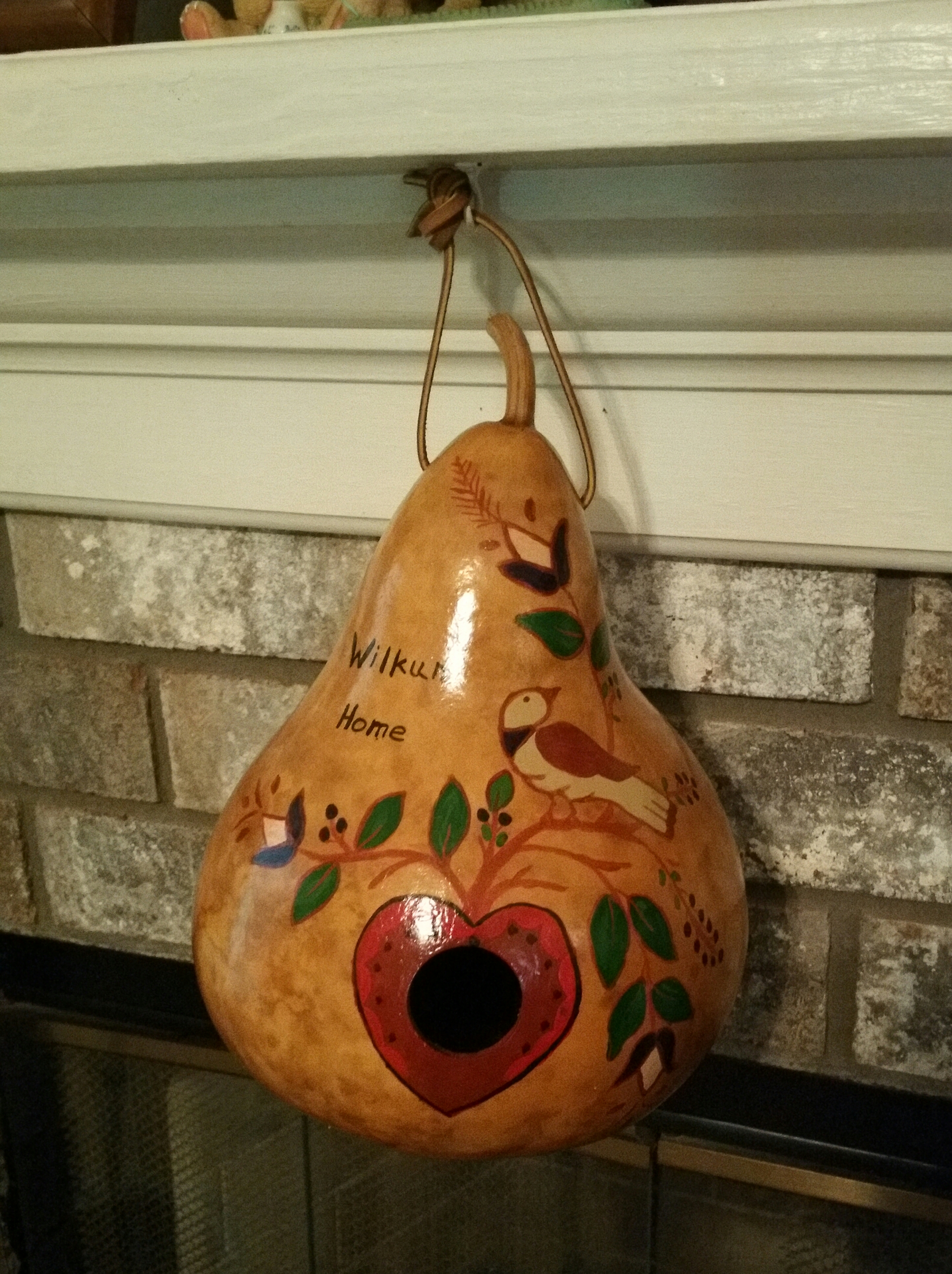 The first photo is of  one of several PA Dutch hex signs in my foyer.  The second photo is a birdhouse gourd, painted by the Amish, that my son brought back from a recent trip to PA.  I hung it at the center of the mantle on my fireplace.  The last photo is one of my favorite cross-stitch pieces, that  I stitched probably 25 years or so ago.  I just love that design.  I took an old beat-up frame, sanded it, and painted it gold and also I couldn’t find a mat in the the color I wanted.   So, I took an old, off-white mat, I already had and painted it blue.  To the right of the cross-stitch piece is a copper Turkish mess kit, with three stacked compartments for food.  My youngest sister found the mess kit while stationed in Turkey, during her Air Force career, and she gave it to my husband.  To the left of that cross-stitch picture there are a couple old electrical insulators……. my father gave me several of those.  Like I said, I have acquired a lot of old “stuff” and “knick knack stuff”.  My youngest daughter keeps her house to the minimalist look, so I think the endless stuff to dust in my house traumatized her;-)
