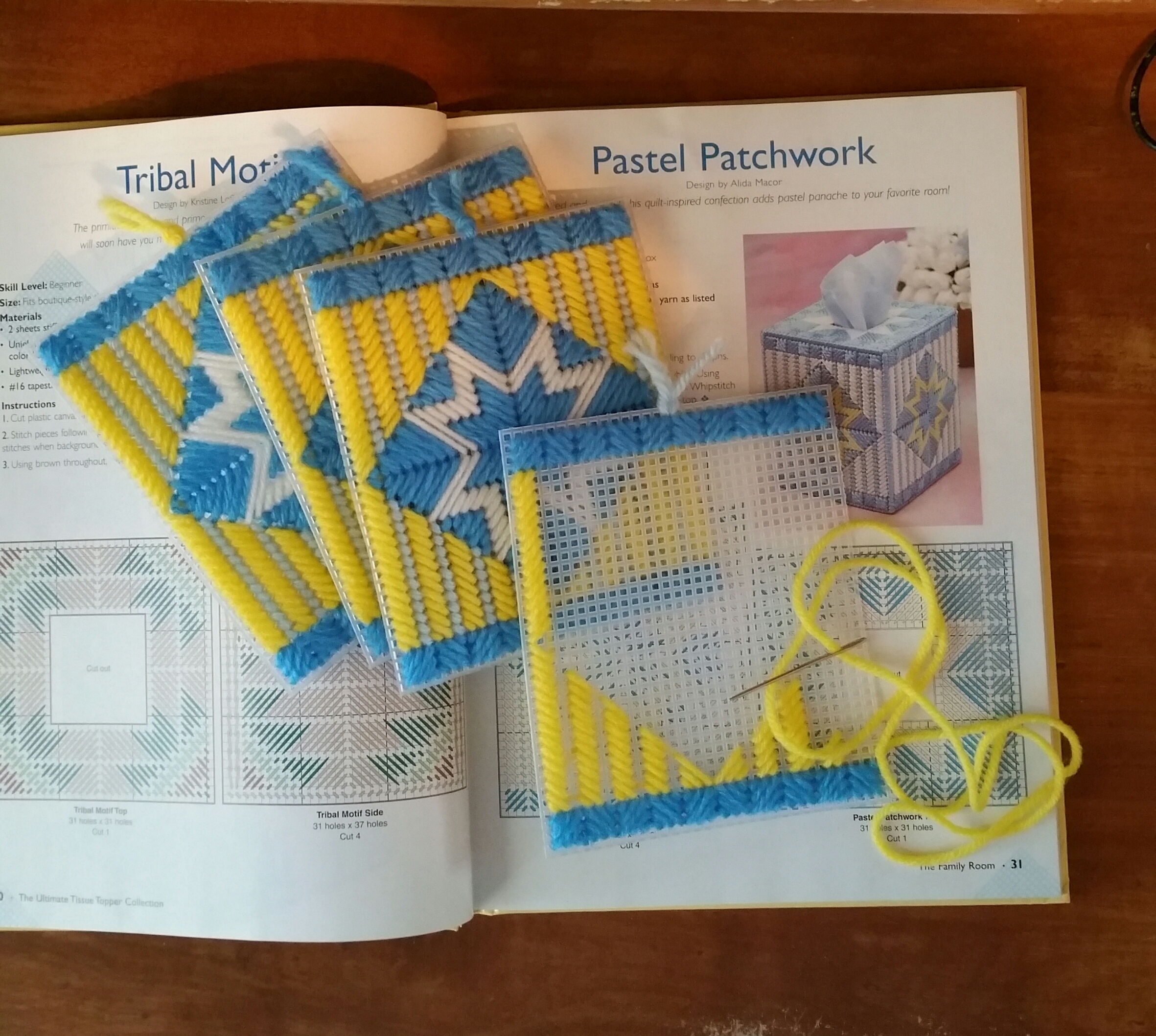 While rummaging around in my plastic canvas supplies I came across this tissue box cover from the late 90s, that I had stitched all the sides and top and stuck it in a ziploc bag, thinking I’d start making several tissue box covers, put the pieces in ziploc bags with yarn to stitch the sides and top together later. It takes very little time to stitch the pieces together and I thought these might be nice to have ready as last minute gifts. So, after I make 4 more, that I committed to make for people, that’s my plan.