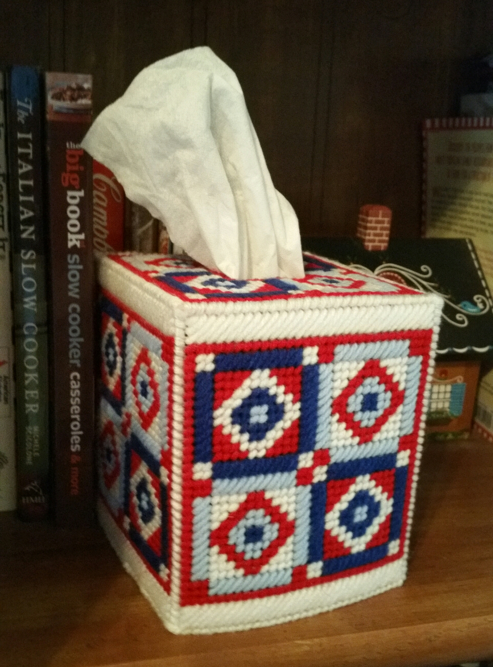 Finished these two tissue box covers in the past couple weeks. The information war being waged in America worries me a great deal and needlework relaxes me… so, I guess it’s time to pull out all those not completed sewing and craft projects and get busy on those too in the next 4 years. Who knows, I might even clean out my sewing and craft room and donate a bunch of stuff to schools, nursing homes or the senior citizen center. My fabric collection is more than a dozen large plastic tote containers, from years of working in a fabrics and crafts department at Wal-mart and buying fabric that was on clearance.
