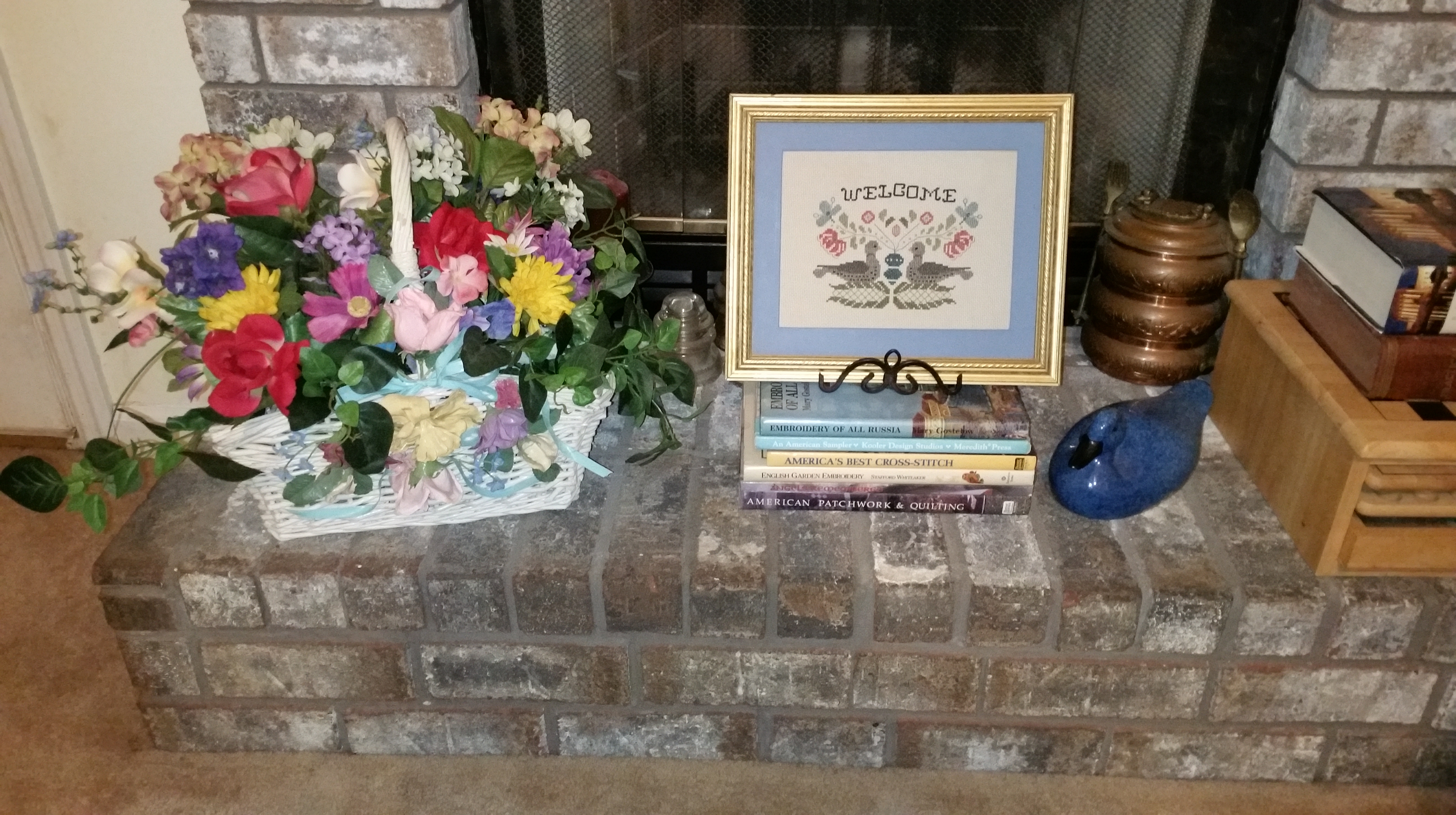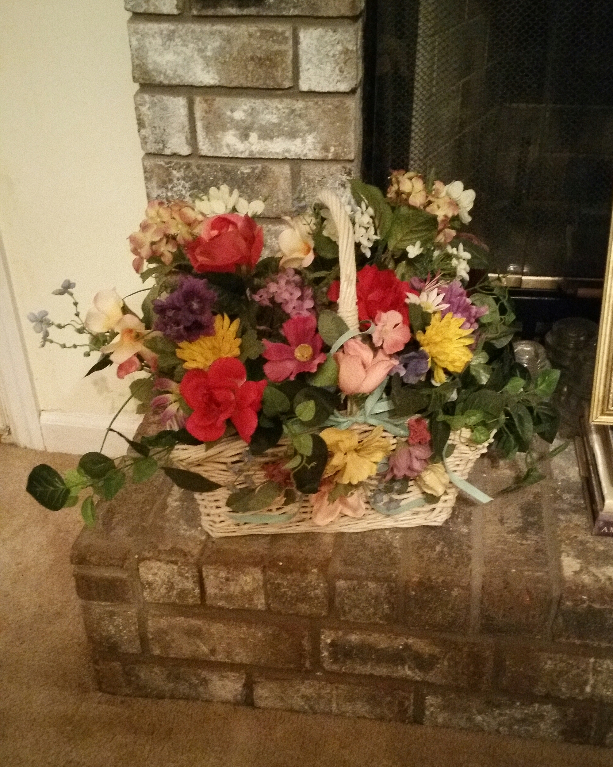 Decorating dilemma with my hearth. On the left side of my hearth, I had pot with a snake plant in it, but the snake plant bit the dust. One of my dogs started grabbing mouthfuls of the dirt and spreading it around the living room, so I decided to use an old basket my sister had decorated long ago and some old Walmart clearance silk flowers I had. Color combos aren’t my strong suit and I don’t know anything about flower arranging, but I like how it turned out.