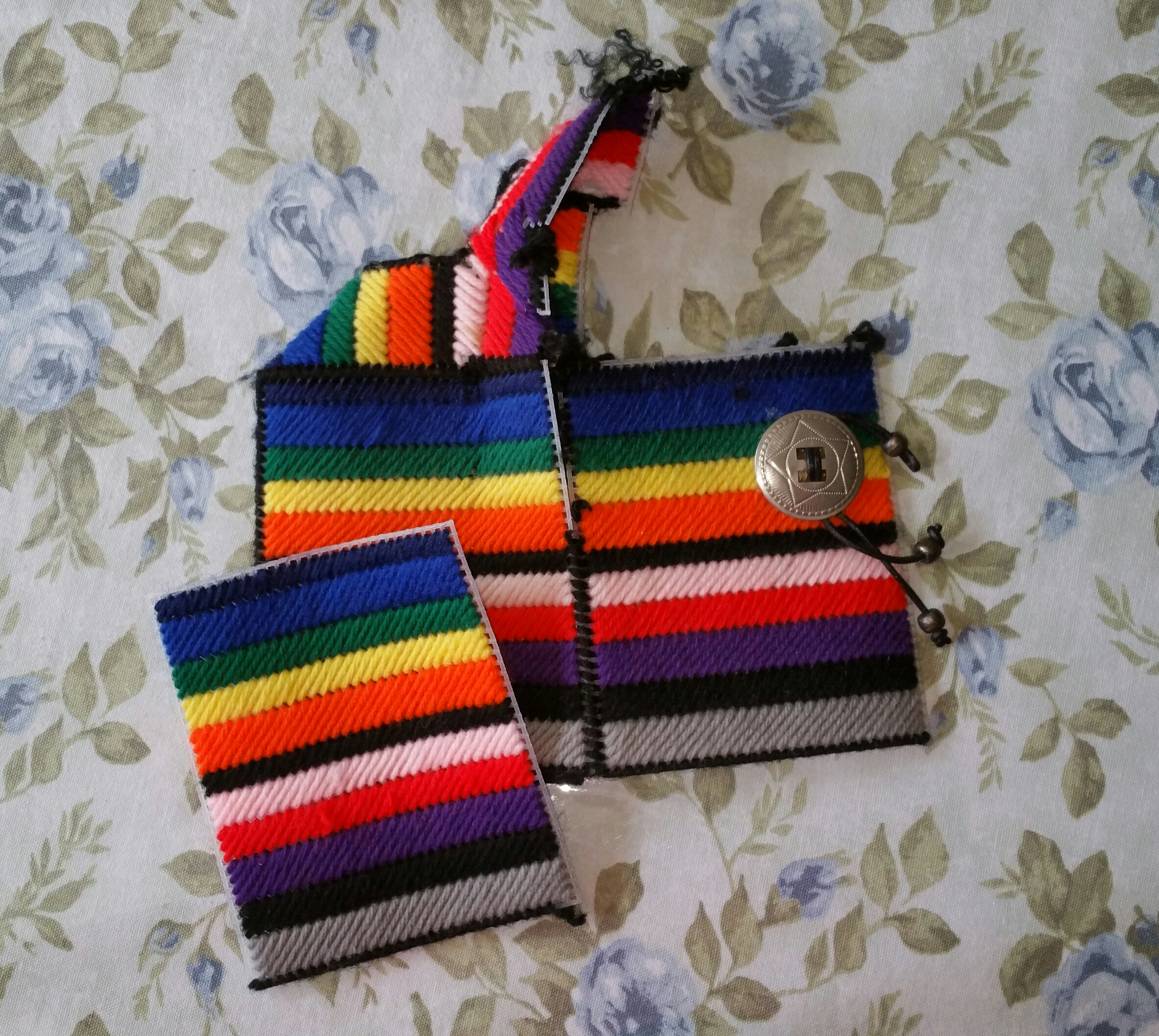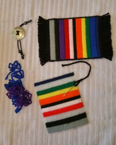 I pulled it out a few days before Mother’s Day and I restitched a new one, salvaging the concho trim and reusing that. I salvaged two sides and had to take out some stitching and replace it, but the plastic canvas was intact. I made those sides into mug mats, by adding fringe on the short ends. The pattern was from a magazine and it’s supposed to look like a Mexican striped blanket. Despite this design not being my taste really, I am keeping this tissue box cover and the mug mats for sentimental reasons