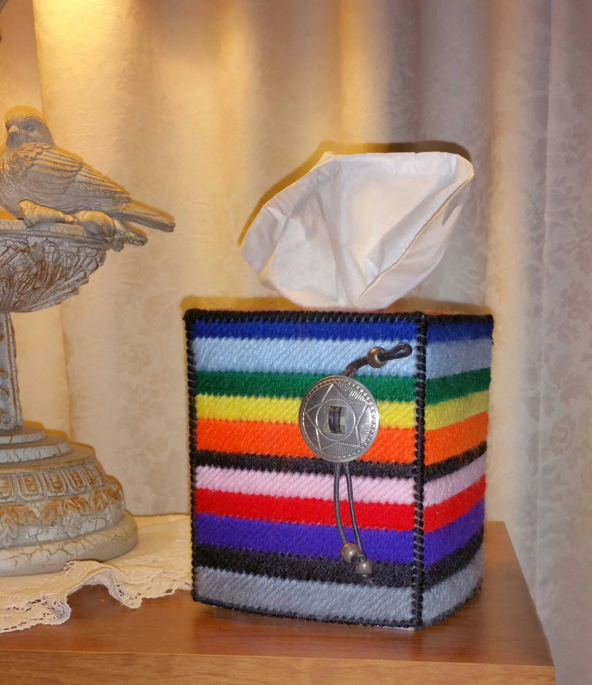I also stitched two other plastic canvas tissue box covers in the past few weeks. One I already gave to a friend, but here’s the other one:
