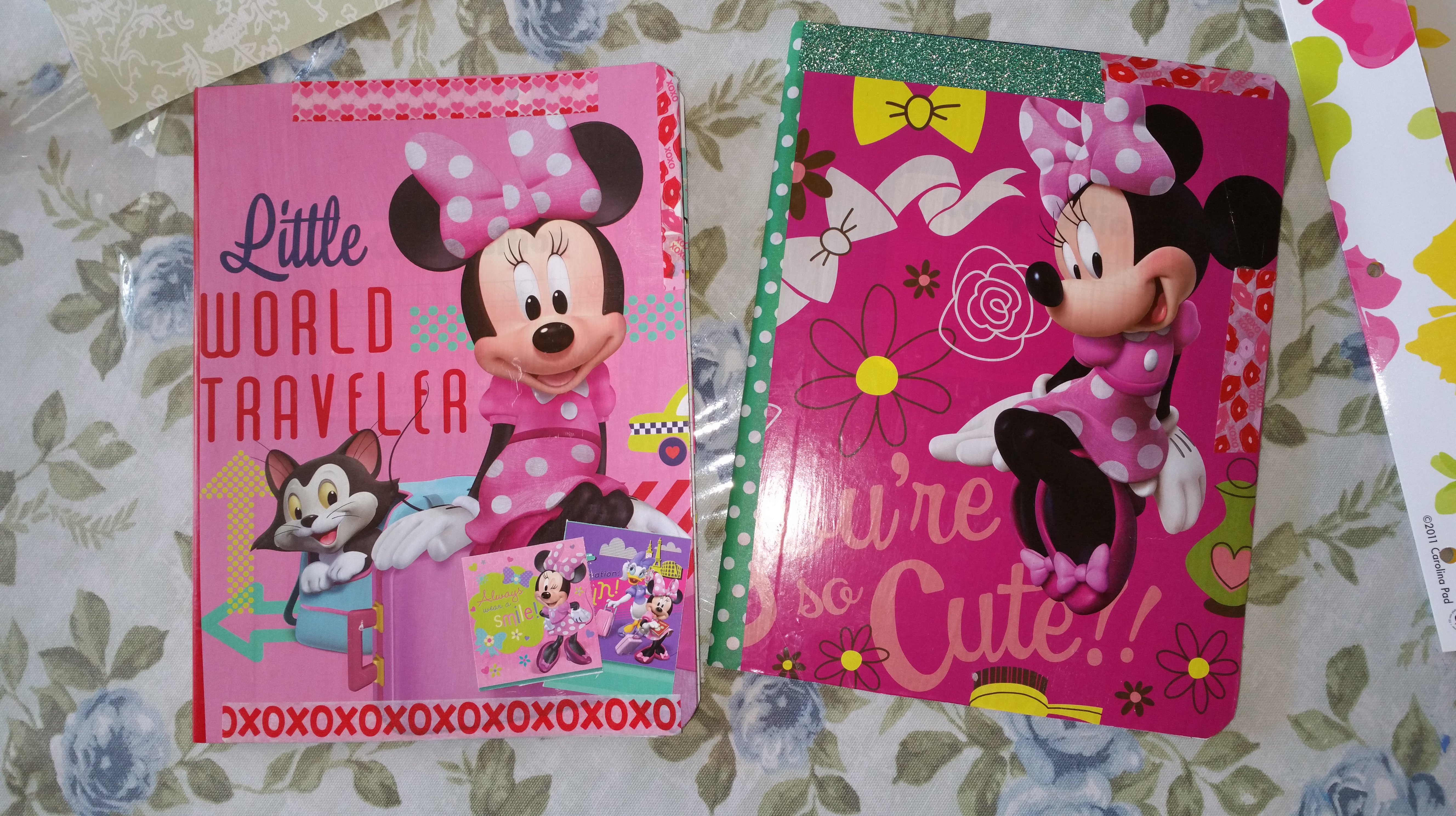 I’ve been doing some simple altered composition books for the granddaughters using old calendar pictures and clearance washi tape (a decorative Japanese-type masking tape) I bought at Walmart years ago. Minnie was my sewing room 2015 calendar. Throughout these, I’m gluing some small pictures and interesting facts from a couple Goodwill, 39 cent children’s books – an almanac and a Rosie O’Donnell kids’ joke book. I made a pocket inside the front covers, where I’m putting several pages of word find, crossword and sudoku puzzles too.