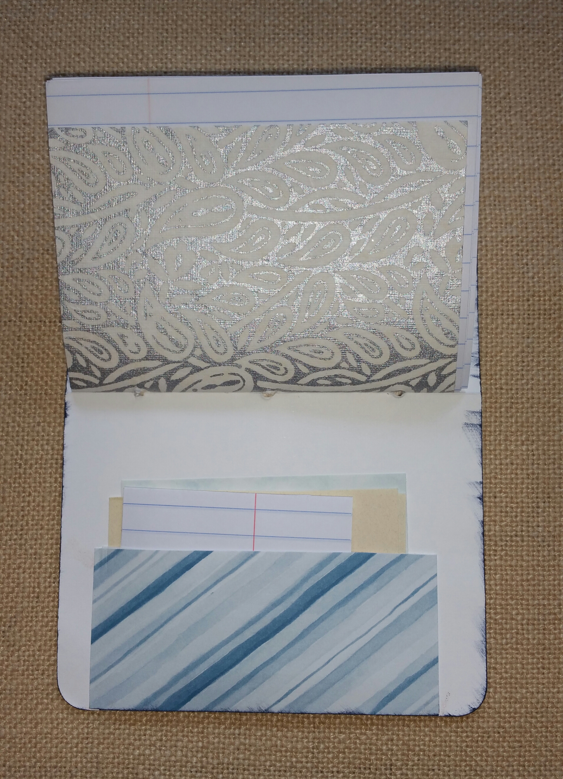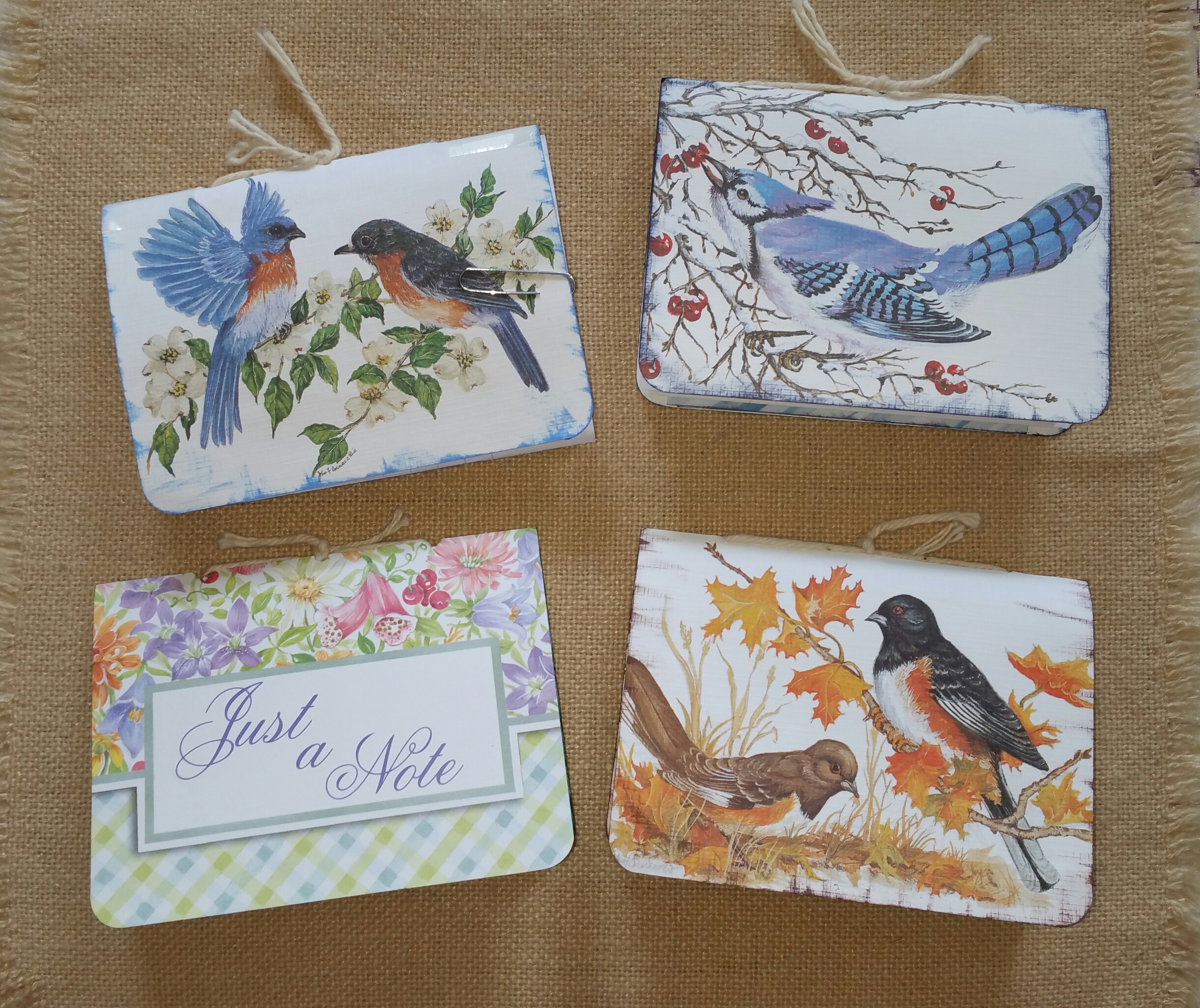 Old greeting cards turned into little notepads, using the 3-hole pamphlet stitch and kitchen twine. They are filled with odds and ends of old scrapbook and notebook paper. Some, I added a pocket in either the front or back to hold small pieces of paper or notes. I made about 20 of these a week or so ago, but gave most of them away already. I’ve got more old cards sitting here to make more of these, but I am altering the construction to reinforce them along the fold. I’ve had the top left one in my purse for over a week and had to tape along the fold, because it wasn’t holding up. I might run tape along the fold or glue cardstock to the inside of the cards. Another idea is to mod podge the cards to make them more durable covers.