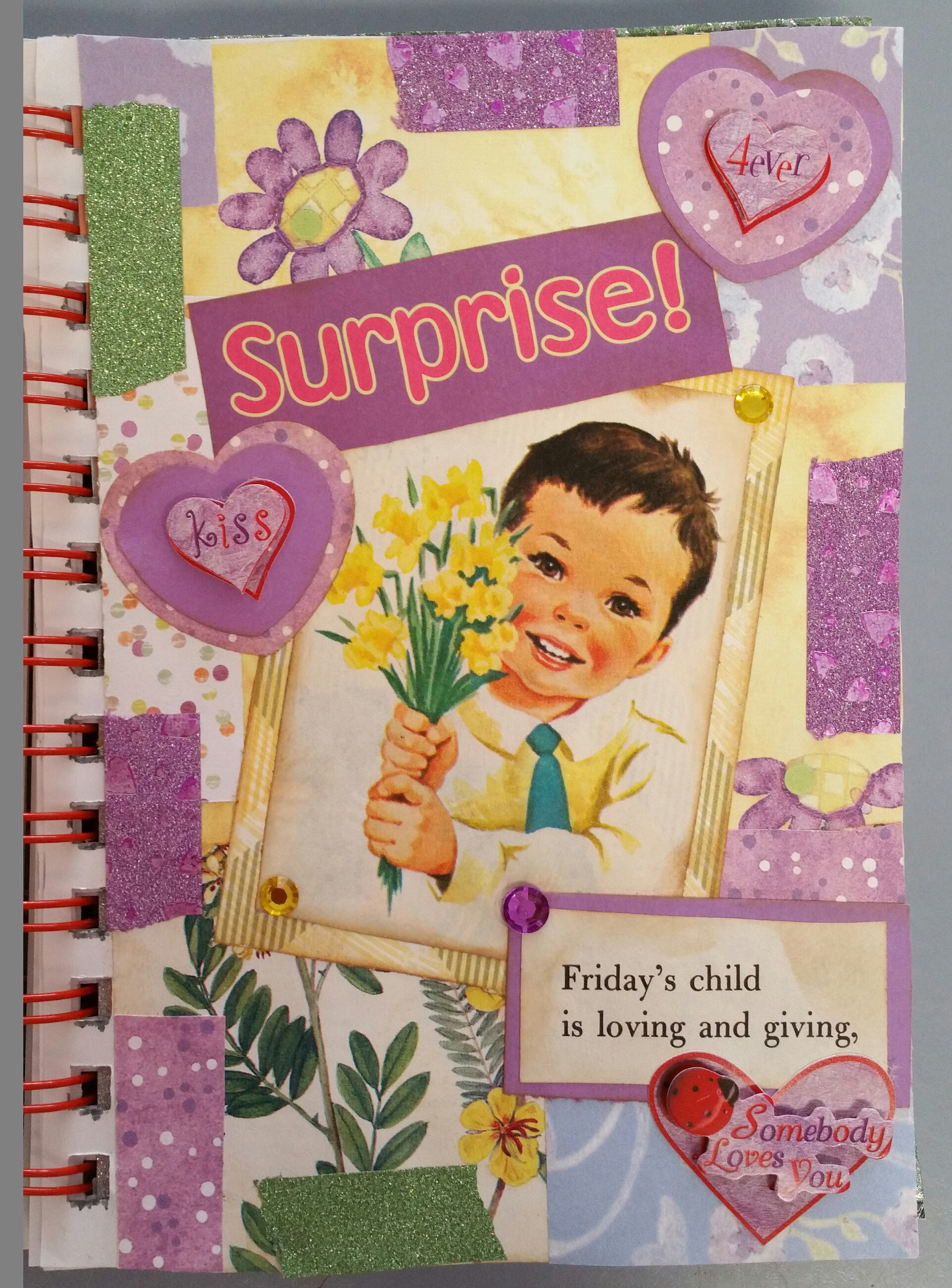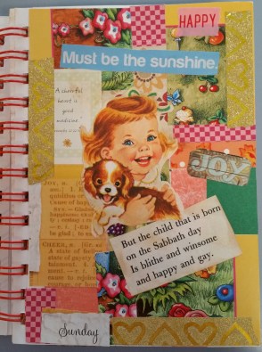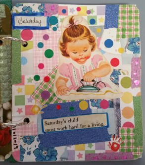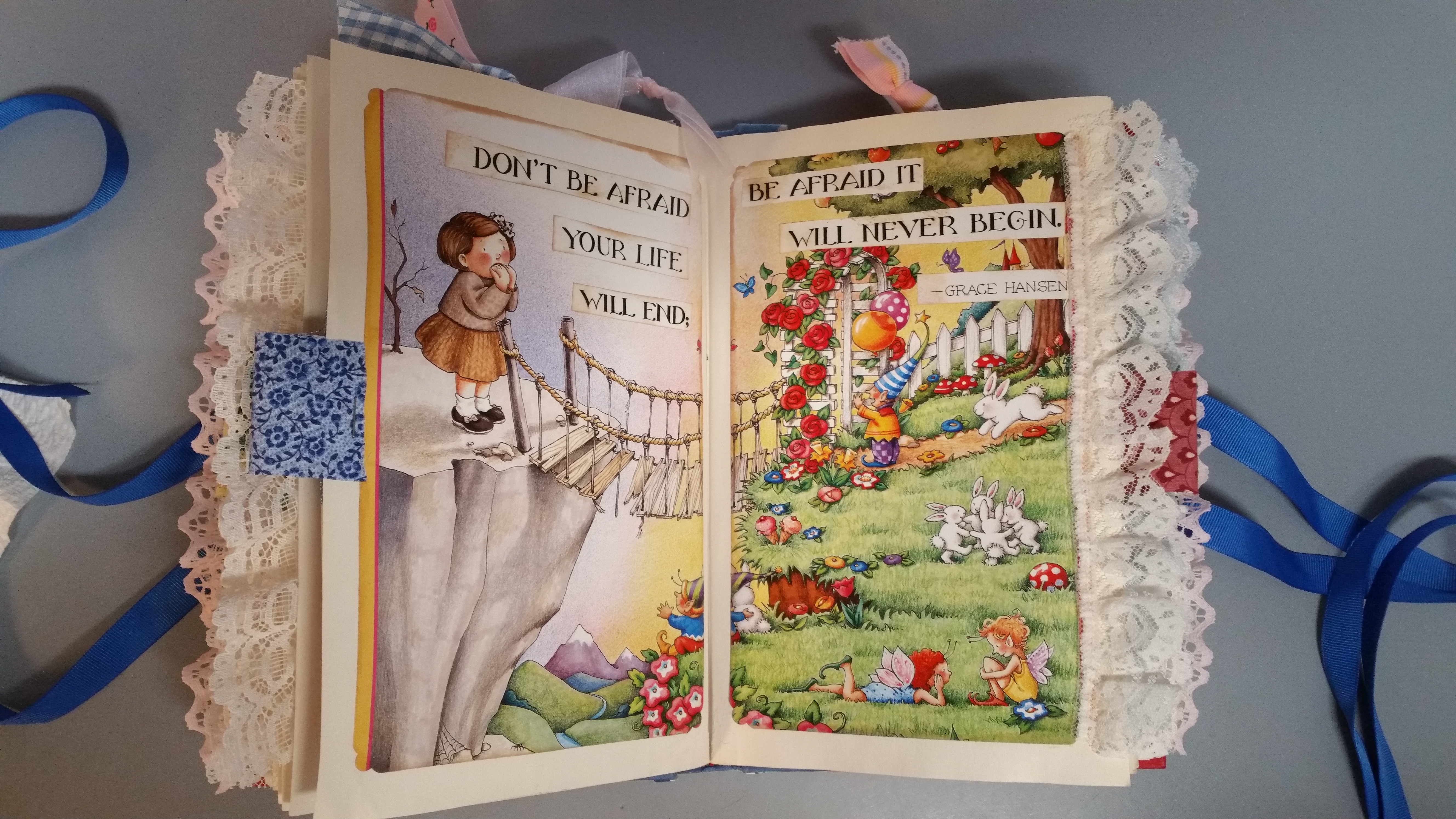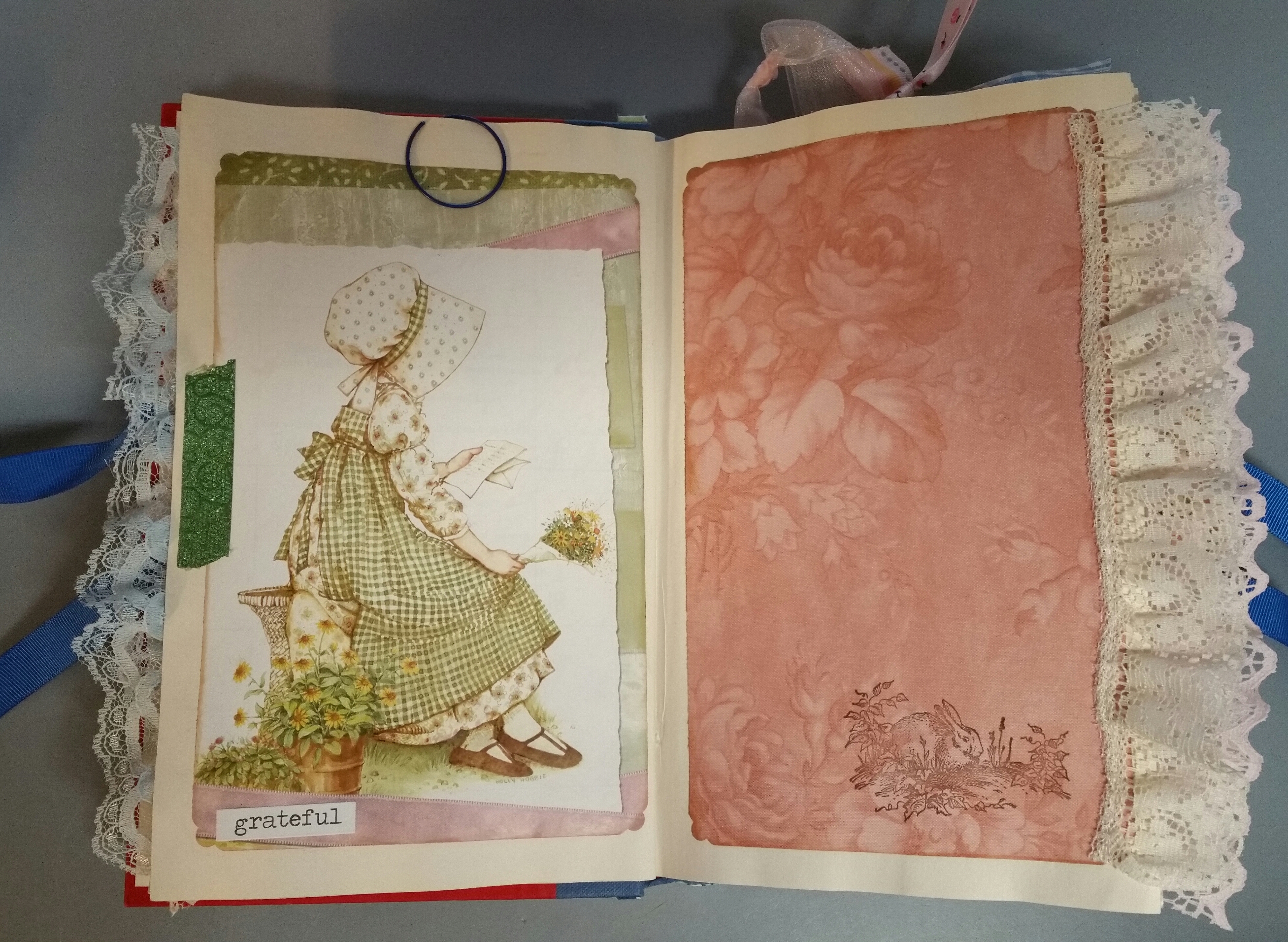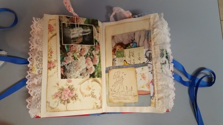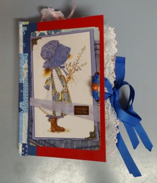 I have been crafting more. I made the above junk journal from another repurposed Ann Coulter book. I will be glad when all of those are sanitized into something pretty, lol. This one is for my best friend from high school. My friend used to collect Precious Moments figurines, but I didn’t have any Precious Moments pictures, so I used my old 2006 Holly Hobbie calendar and a picture from an old Mary Engelbreit calendar. Here are some more pictures from this junk journal: