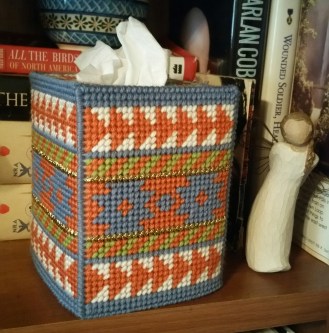 I also finished this plastic canvas tissue box cover and started another one – have 3 sides done, while reading Twitter:
