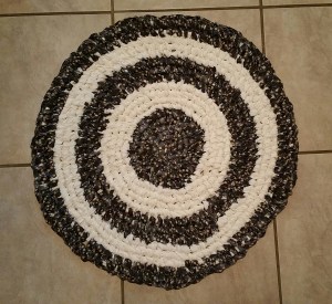 I don’t feel like rehashing all of this, so this post is going to be some points, then I have housework to do and I am learning how to make Amish knot rag rugs  Made my first small rug a few days ago using old fabric from the 90s.  The technique is simple, but as with most craft and needlework, I need to practice a lot more to get my knots a uniform size.  My first rug is 24″ across:
