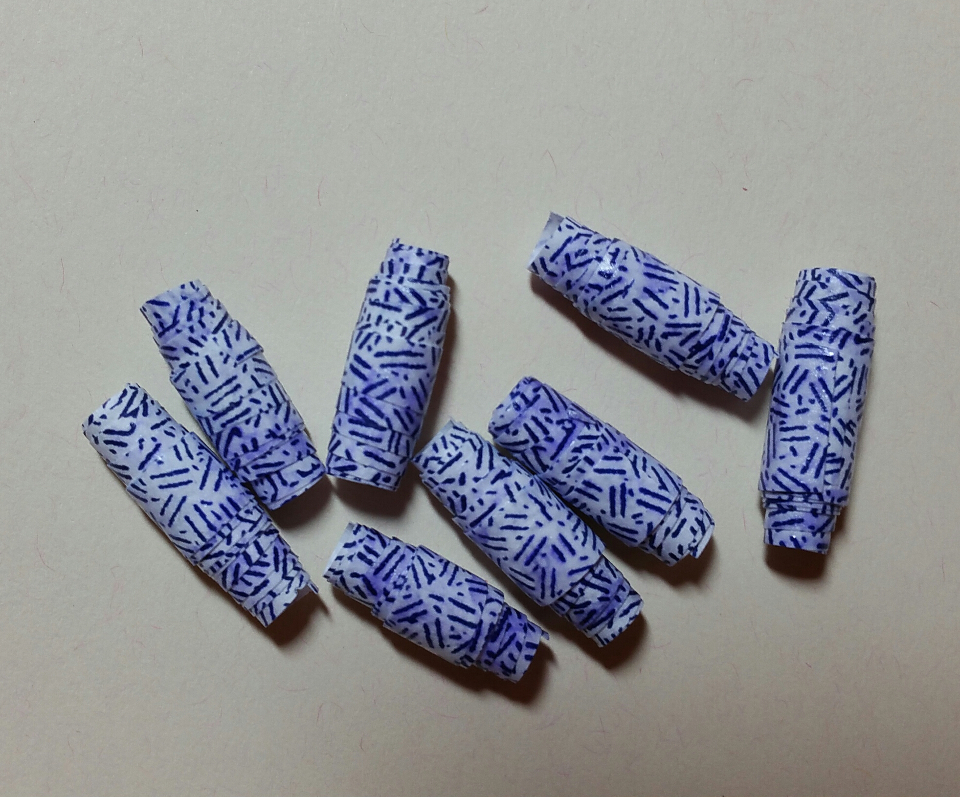 My paper beads are very simple and I’m definitely not an expert at rolling these beads yet, but I still will be able to use these (and the dozens of others I’ve made) when making junk journal embellishments. I’ve been using a pair of chopsticks that came in Chinese takeout as my bead rolling tools. Here are a few beads from a security envelope: