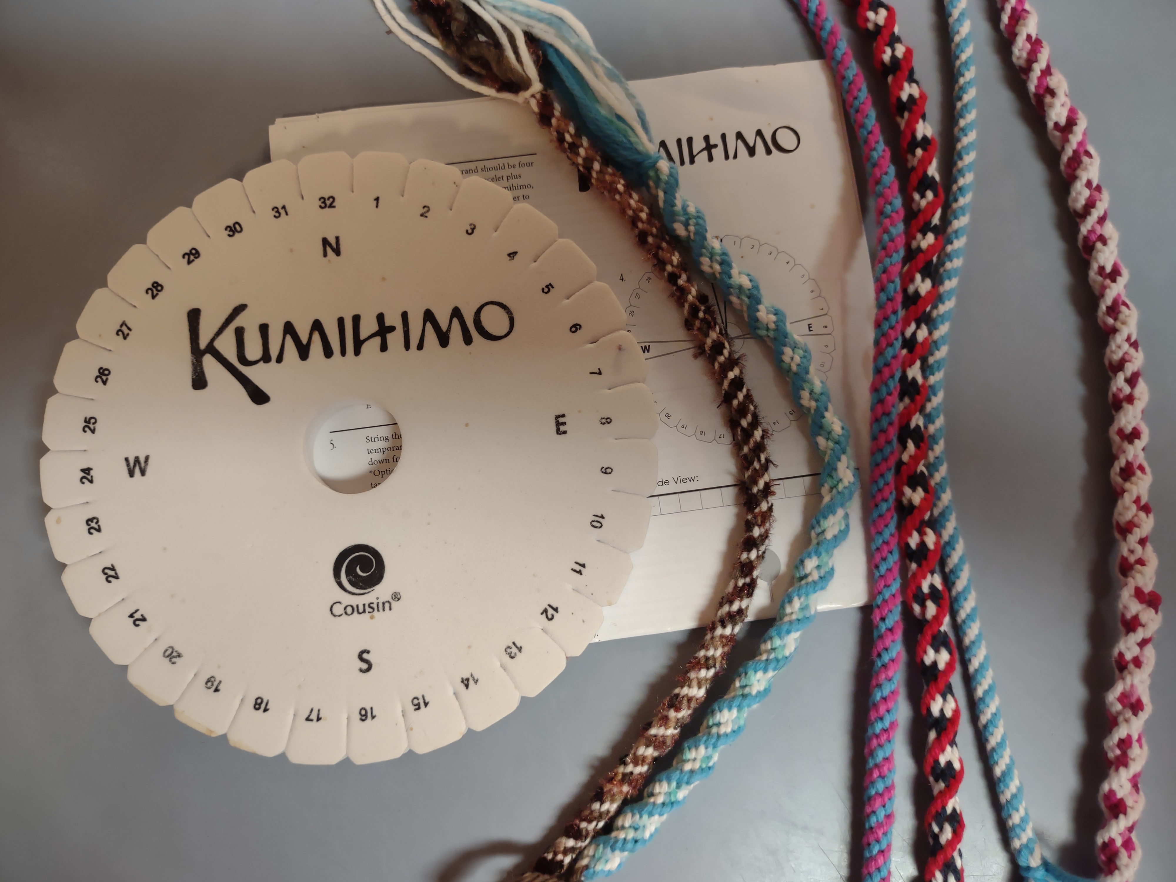There are crafters who make beautiful beaded kumihimo jewelry, but with my ever-growing list of crafts and needlework hobbies, I just learned how to do a few different braids, using various types of embroidery floss and yarn. I haven’t really gotten into kumihimo, but I’m glad I learned a few simple braids. Please excuse my terrible photography, but here’s the foam kumihimo loom with a few of the braids I made.