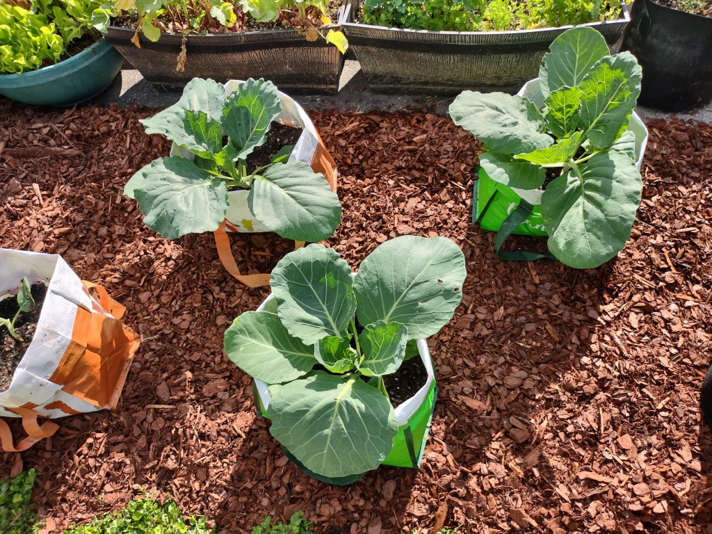 I’ve worked on container gardening this spring. I started seeds with that winter sowing method, but it was really pointless, since I live in zone 8b. However, in the gallon jug I had 5 cabbage plants started. I planted them in Dollar Tree shopping bags (purchased when it was still a dollar) rather than toss them. So far they’re doing fine in these bags:
