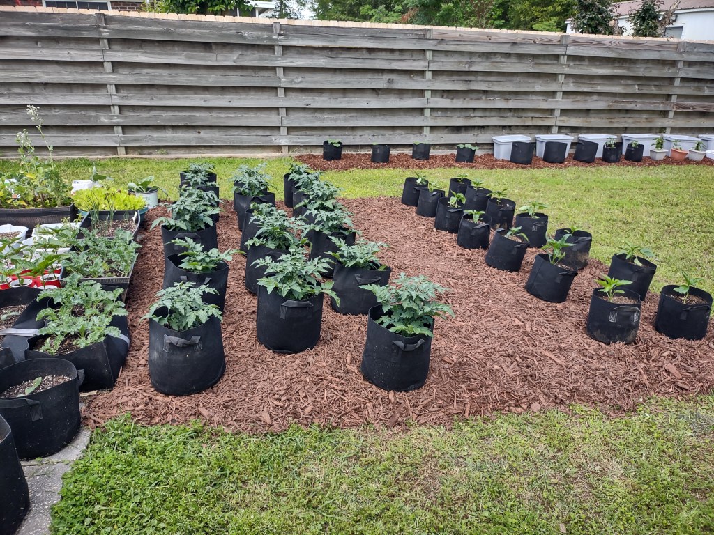 I put cardboard down and bags of wood mulch to spread out my containers, because my patio was getting too crowded with containers and I’m still working on that. I ran out of cardboard and have used weed-block fabric too. I used grow bags I ordered from amazon, various cheap plastic containers and things like these Dollar Tree bags. The most expensive part of this has been buying potting soil.