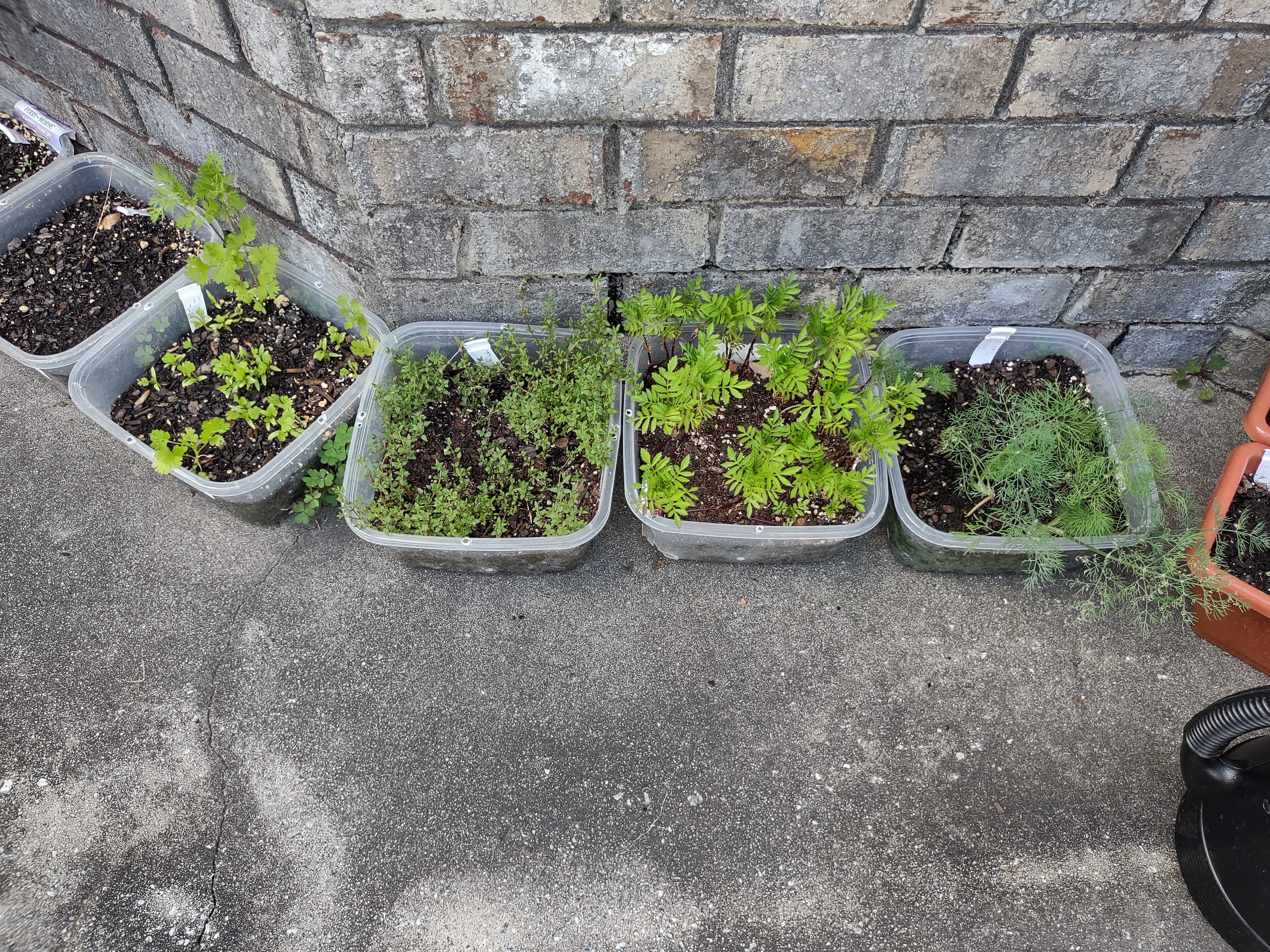 I have herbs and some flowers started in square food containers from Dollar Tree: