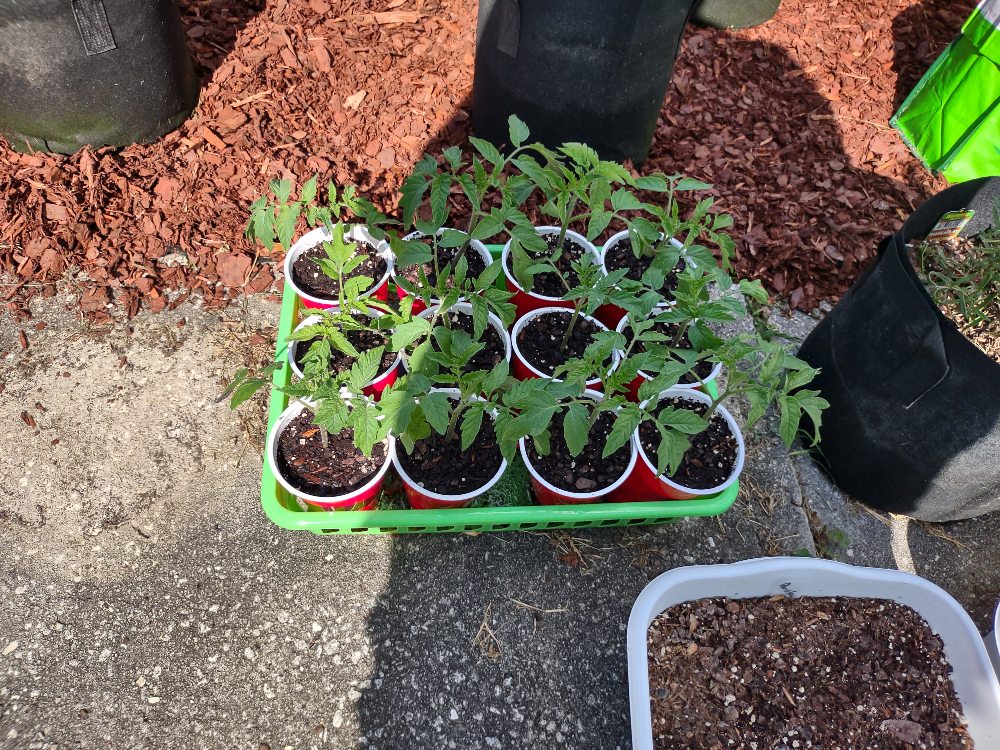 What I don’t have, yet, are any raised beds, so I just moved ahead with the containers for right now. I planted everything from seed, except I bought the blueberry bushes, obviously and I bought seed potatoes and onion sets. I also have a rosemary plant I bought at Walmart. For potting up seedlings, I put holes in red Solo cups and I washed all of them, so I can use them again. I intend to reuse all these grow bags and cheap Dollar Tree containers. My backyard stays very muddy and kind of swampy after it rains, so I am hoping this wood mulch helps keep things manageable. I heard some gardener guy talking about wood mulch attracts slugs and snails, so I’ll watch and see.
