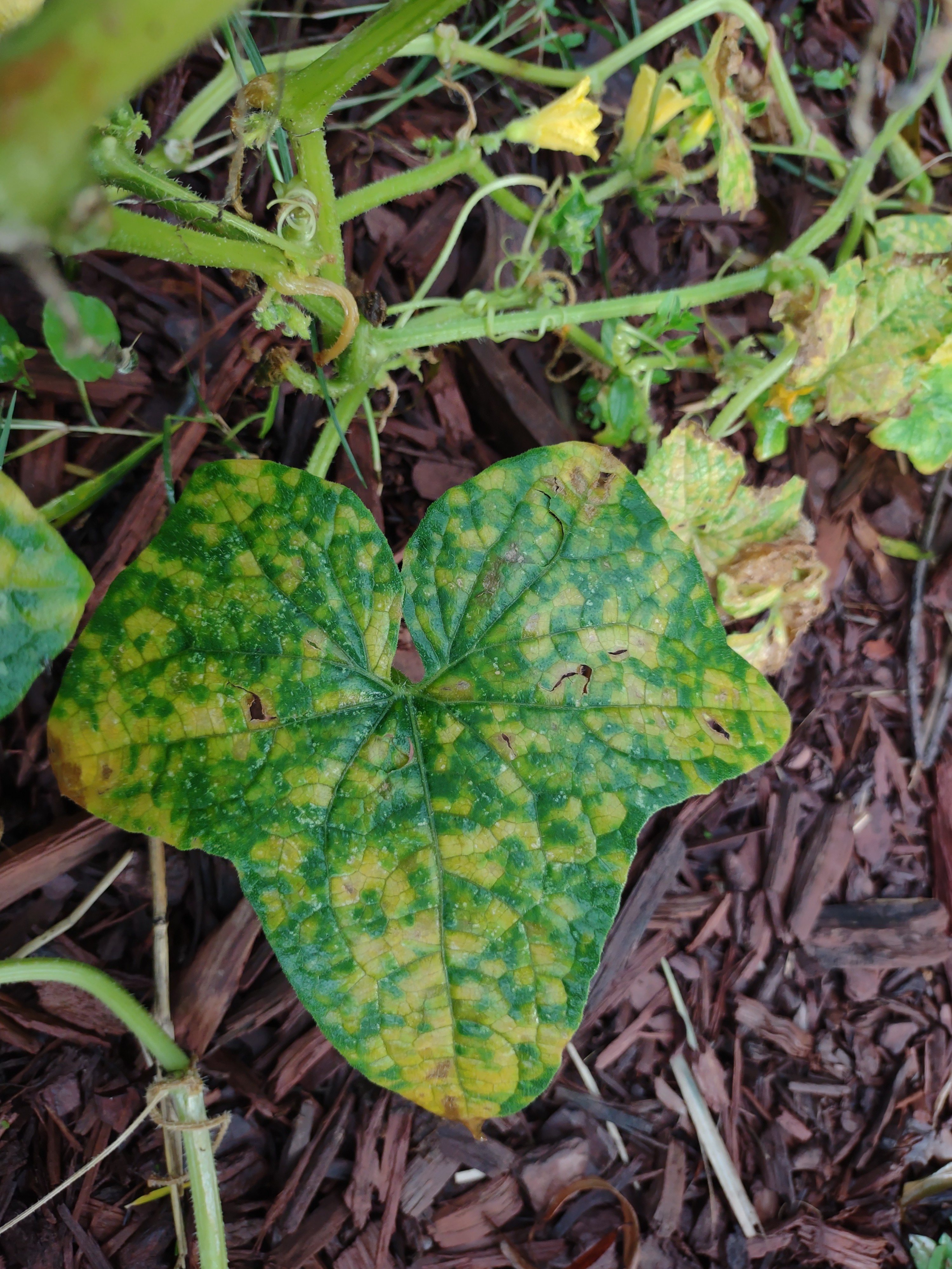 I replanted cucumbers, because my cucumbers have some fungus thing, I guess it is – leaves got yellow spots, which turned into brown spots and then they got very brittle. I tried peroxide in water and sprayed that on them, but it didn’t help. The new cucumber plants are getting the same thing. It’s been very hot, very humid and I’ve got more bugs attacking my plants (and me) than I can identify.