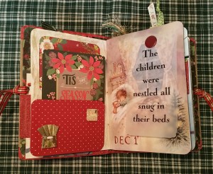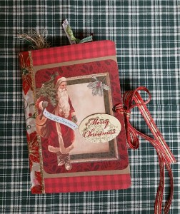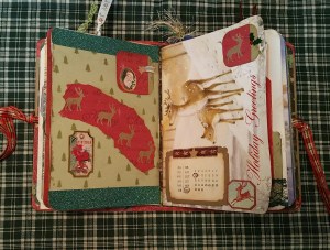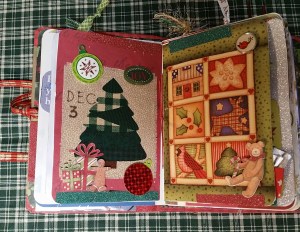 First up, here’s the crafting portion of this post. Among the crafting peeps on youtube and facebook, there are lots of groups and people posting “challenges”, swaps, and assorted group crafting activities. I decided to attempt the December Daily challenge, just for myself. I constructed a junk journal for this project using all paper, stickers, ribbon and trim that I already have. The cover is constructed from a food package box, covered with old scrapbook paper and some old Christmas ephemera. The pages in this journal are all old Christmas cards that I sewed into the spine of the book. I covered the spine with Christmas ribbon that’s been sitting here many years. My personal challenge was to use only stuff I already have. Here are a few photos: