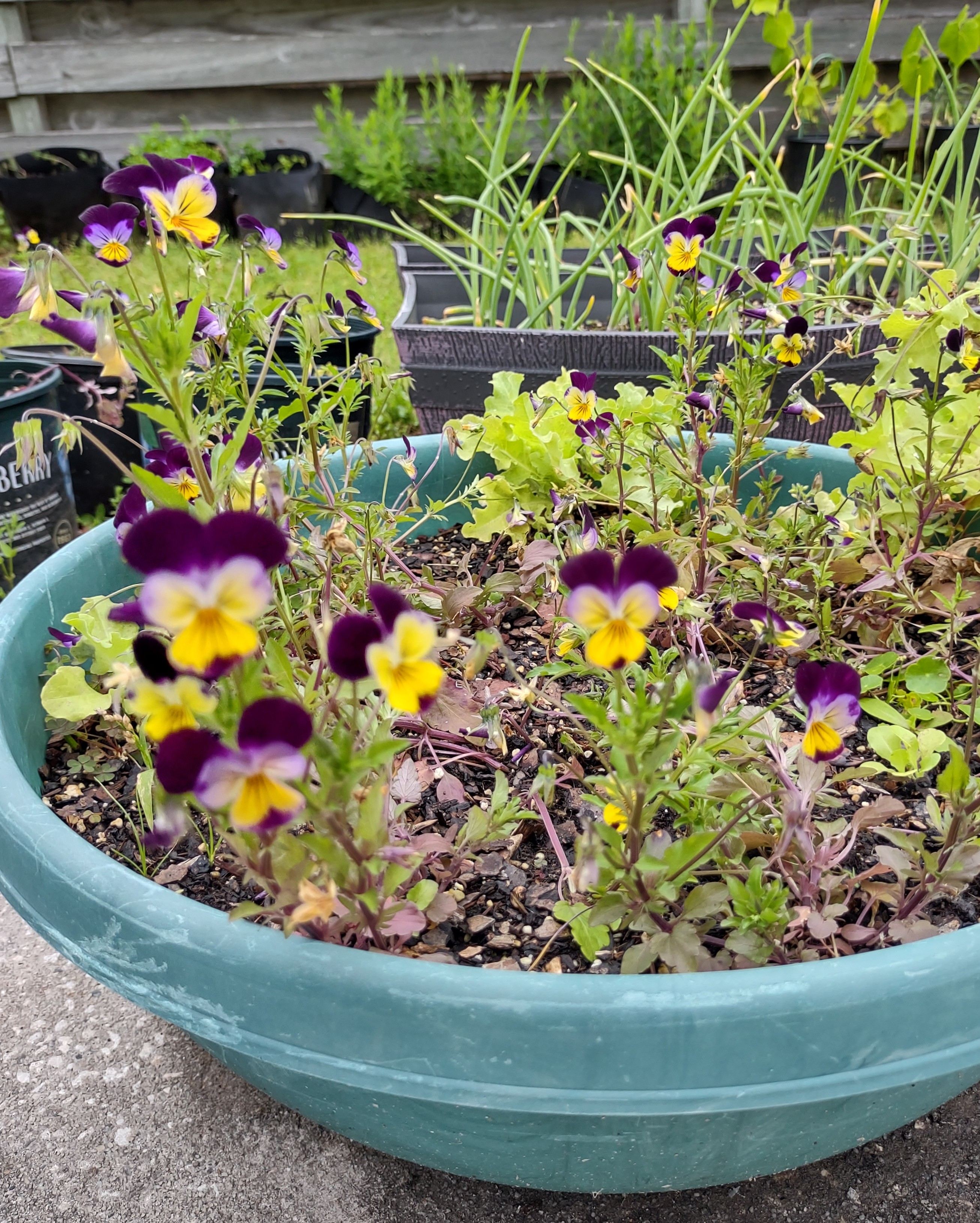 Violas are still blooming and some lettuce seeds from last year sprouted in the container too. I have cosmos and zinnias growing that are from seeds that dropped last year, which feels like a gift.