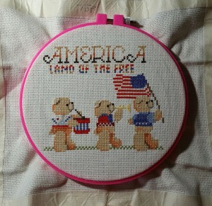 I stitched this small patriotic teddy bear piece last week. Not sure yet, how I want to finish it, but I want to stitch a few more small patriotic pieces before the 4th of July for some small display on my coffee table.